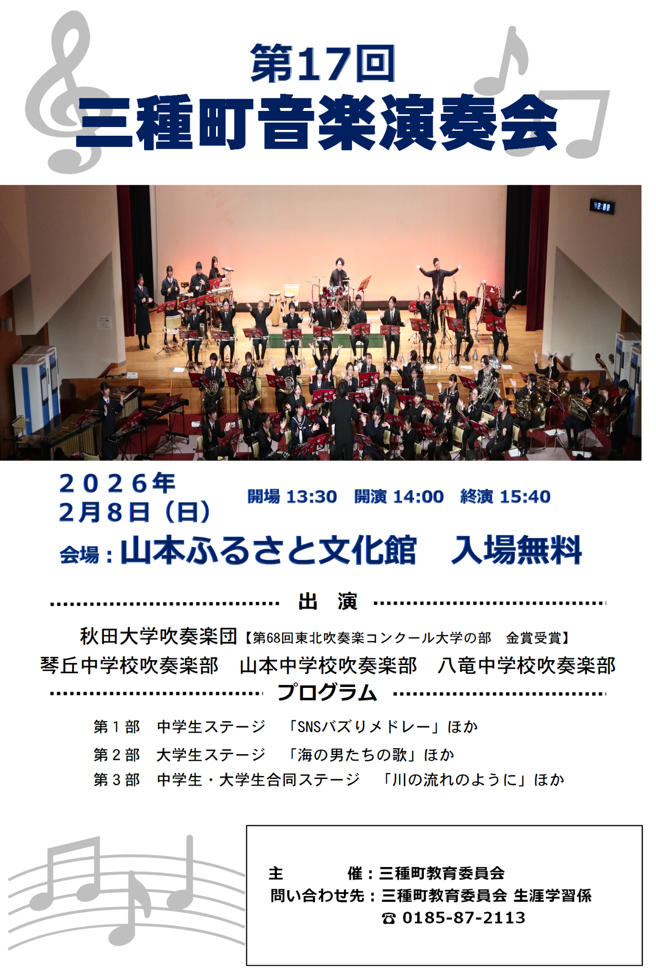 三種町の冬を彩る「三種町音楽演奏会」が今年も開催されます。
